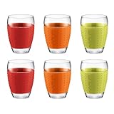 You Save : 25% The bodum pavina glasses are not only practical, they also make a statement. The silicone sleeve functions as a grip while simultaneously protecting your hand from excessive heat and adding a splash of vivid color to your dining and drinking experience. The Bodum Pavina Glasses are made of borosilicate glass and silicone and all parts, including grip, are dishwasher safe. Set includes 6 vibrant colors: black, orange, purple, red, green, and white.